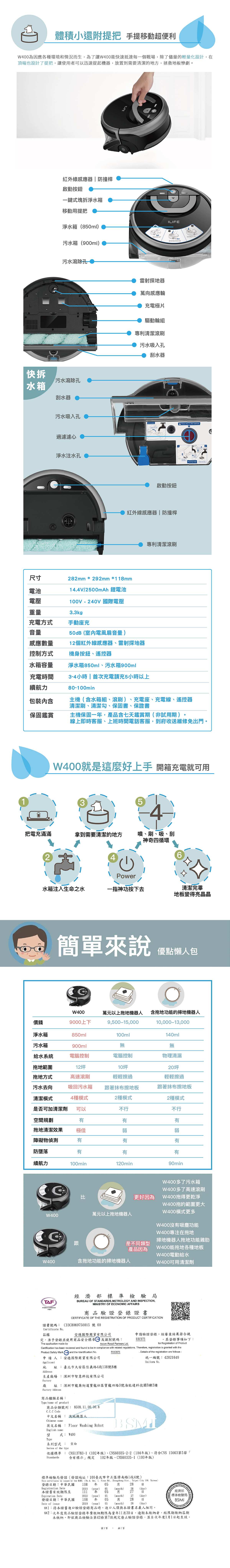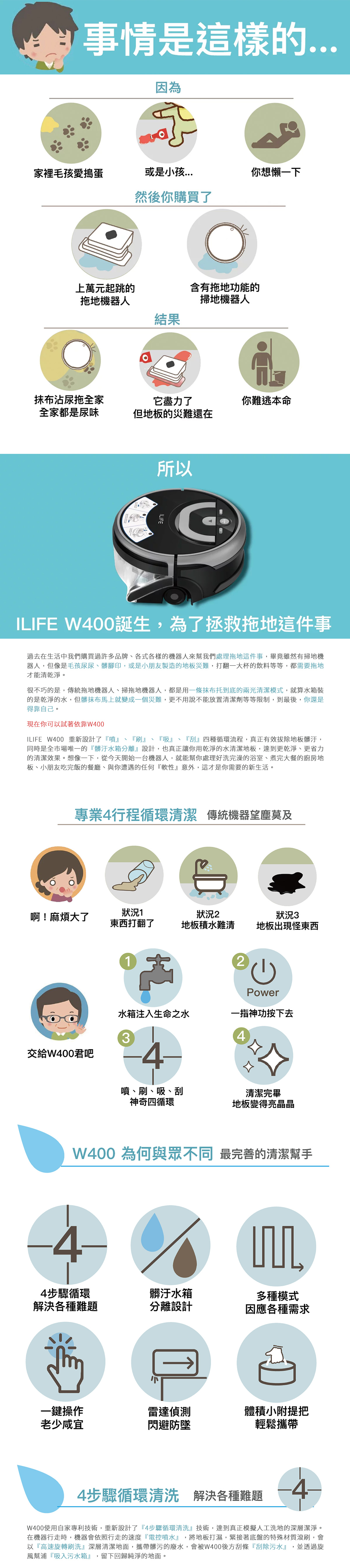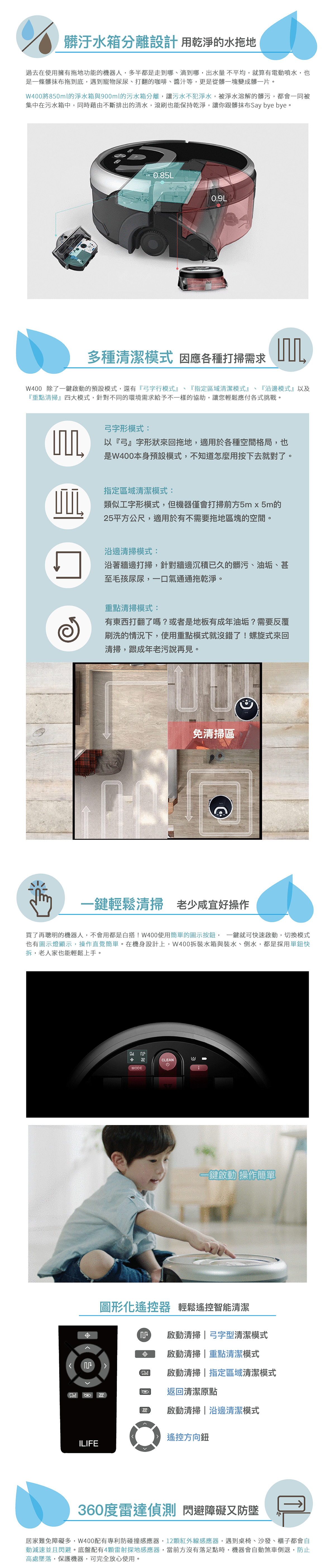 過去在生活中我們購買過許多品牌、各式各樣的機器人來幫我們處理拖地這件事,畢竟雖然有掃地機器人,但像是毛孩尿尿、髒腳印,或是小朋友製造的地板災難,打翻一大杯的飲料等等,都需要拖地才能清乾淨。很不巧的是,傳統拖地機器人、掃拖地機器人,都是用一條抹布托到底的兩光清潔模式,就算水箱裝的是乾淨的水,但髒抹布馬上就變成一個災難,更不用說不能放置清潔劑等等限制,到最後,你還是得靠自己。現在你可以試著依靠W400ILIFE W400 重新設計了『噴』、『刷』、『吸』、『刮』四種循環流程,真正有效拔除地板髒汙,同時是全市場唯一的『髒汙水箱分離』設計,也真正讓你用乾淨的水清潔地板,達到更乾淨、更省力的清潔效果。想像一下,從今天開始一台機器人,就能幫你處理好洗完澡的浴室、煮完大餐的廚房地板、小朋友吃完飯的餐廳、與你遭遇的任何『軟性』意外,這才是你需要的新生活。