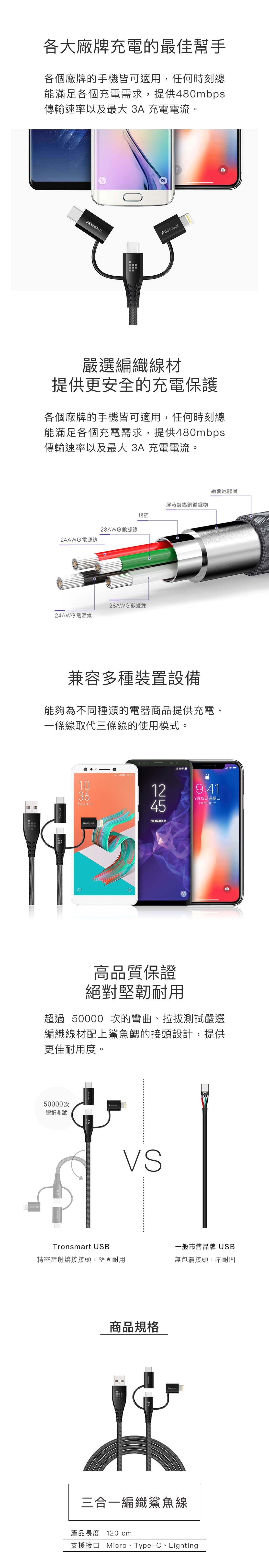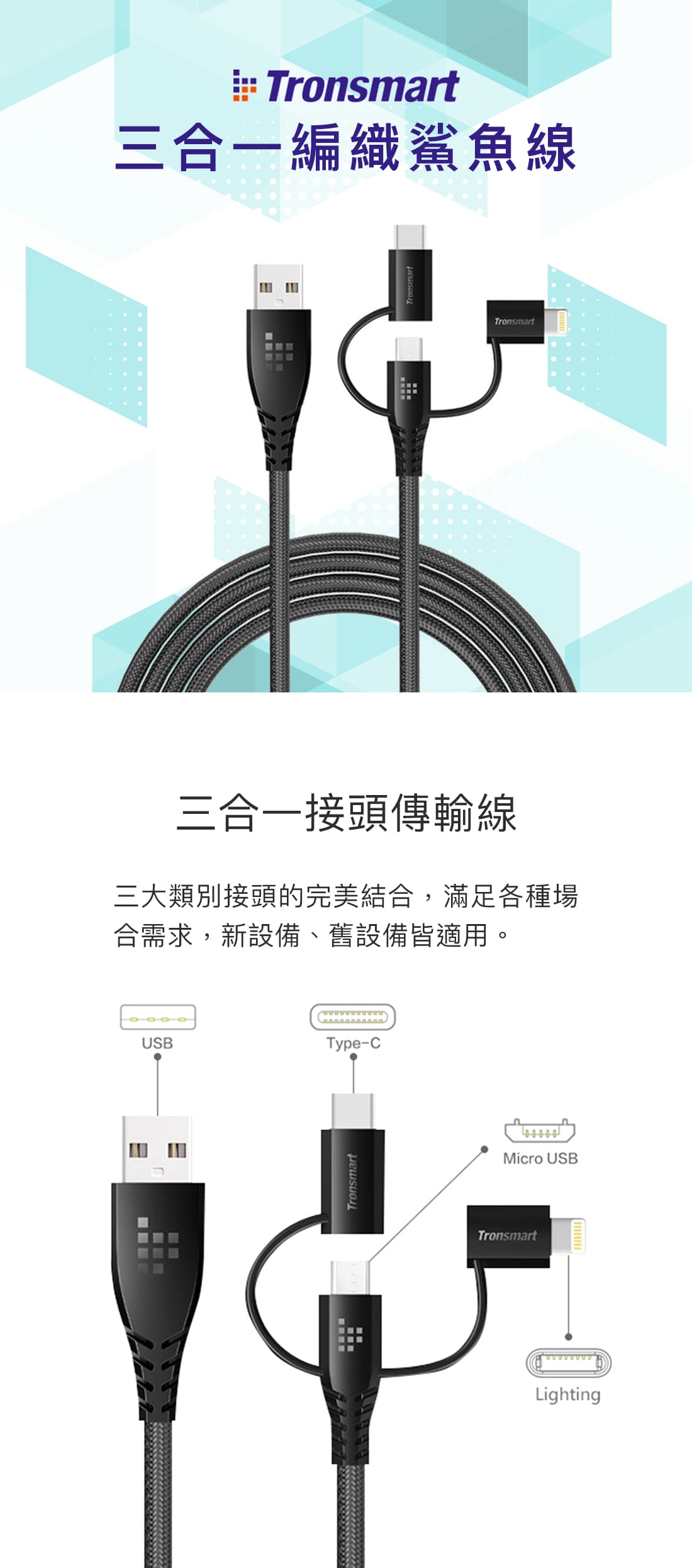 Tronsmart 三合一編織鯊魚線 充電線|可充Nitendo Switch