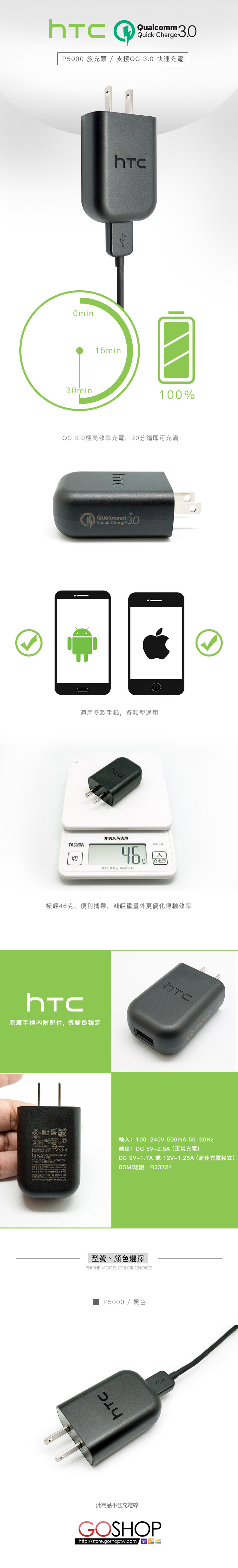 【GOSHOP】HTC 公司貨 快速 充電器 QC 3.0 TC P5000 US 旅充頭 M10