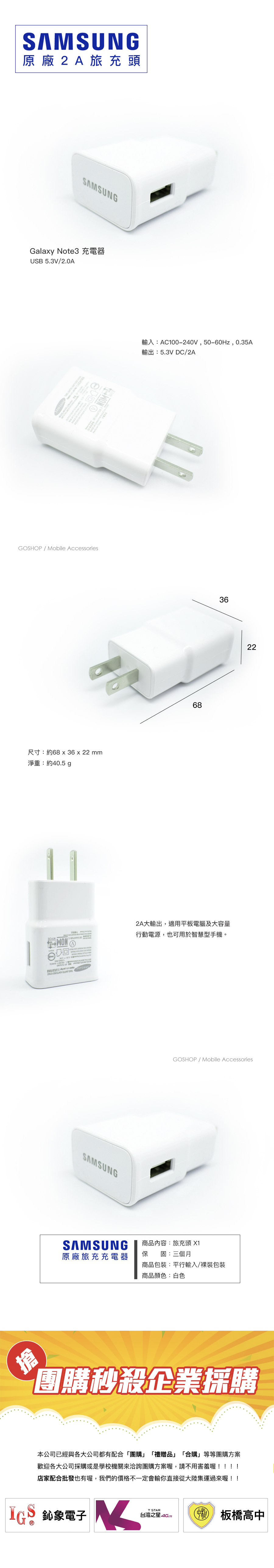 SAMSUNG 原廠旅充頭 AC USB充電器5.3V=2.0A輸出