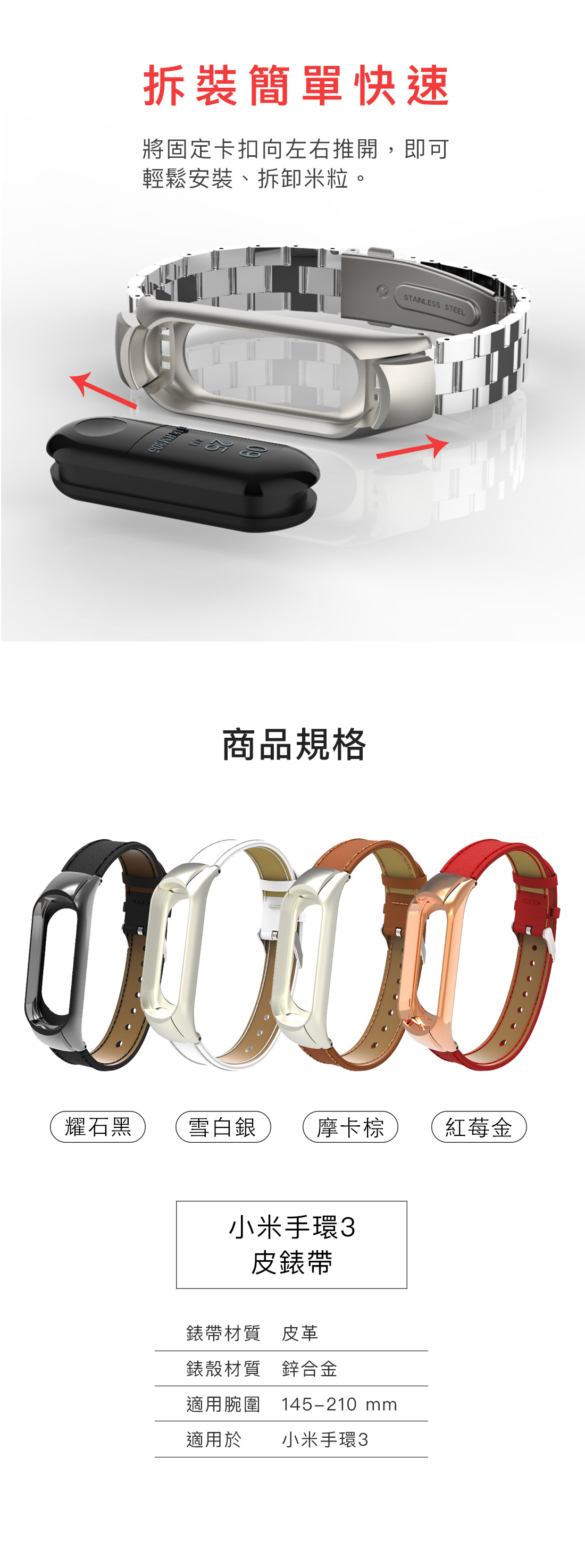 小米手環3 皮革錶帶 黑色款,相當沈穩內斂,適合低調想點綴的朋友帶,不會說帶著矽膠那麼玩具感那麼重,重點放入配置更容易,小米手環3原廠錶帶其實有點太難放入了。坦白說 Mars 反而很喜歡副廠的東西,便宜又好用。